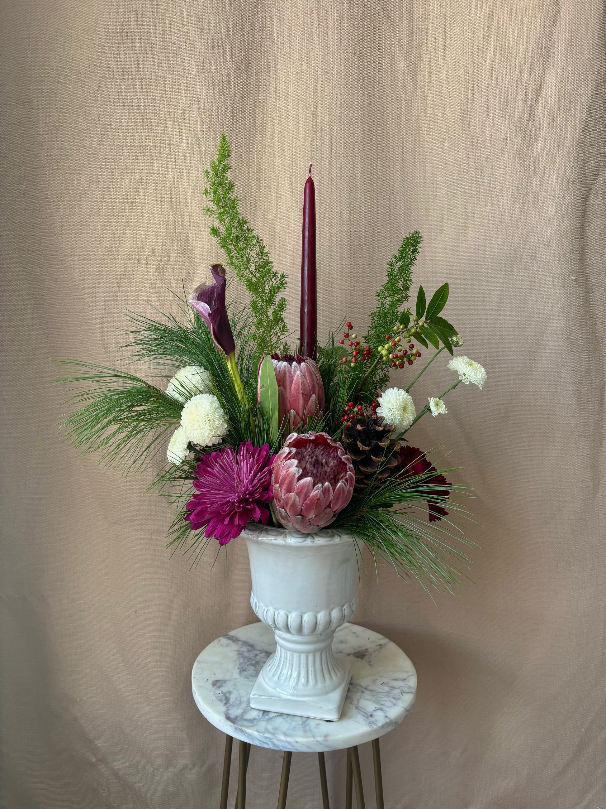 A petite, yet impactful centerpiece for your holiday table designed in a premium ceramic urn. This arrangement features king protea, mini calla lily, pepperberry, ice cap chrysanthemum, foxtail fern, carnation, and fresh pine to leave the room smelling like a winter forest.