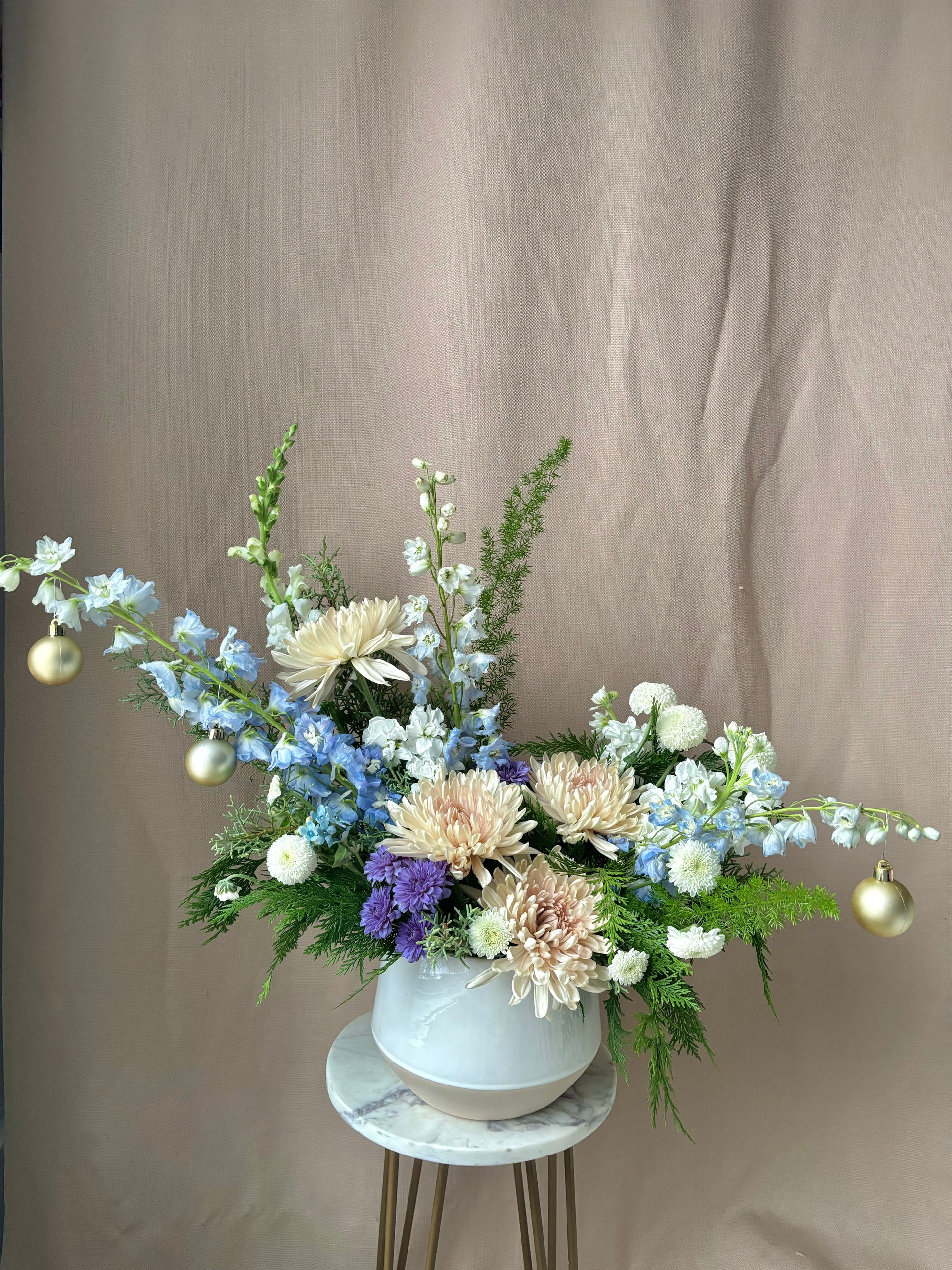A large arrangement designed with blush chrysanthemum, delphinium, stock, ice cap chrysanthemum, tweedia, snapdragon, and foxtail fern with a mix of aromatic winter greenery like fresh cedar, carolina sapphire, and pine.