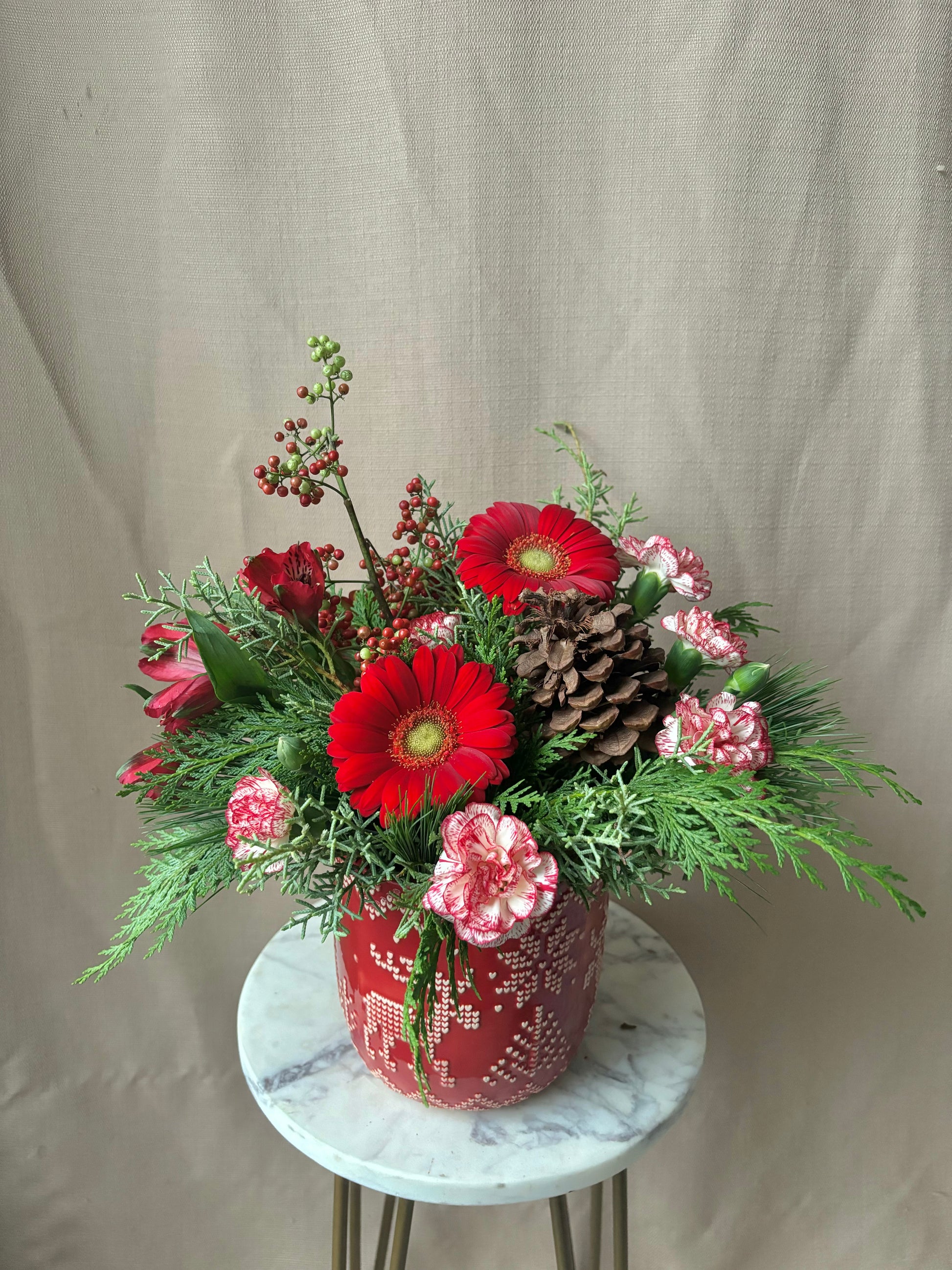 Enjoy a woodsy arrangement in a ceramic knitted-pattern vase - full of aromatic cedar, carolina sapphire, and pine. This petite arrangement includes mini gerbera daisy, alstromeria, mini peppermint carnations, pepperberry, and rustic pinecones.
