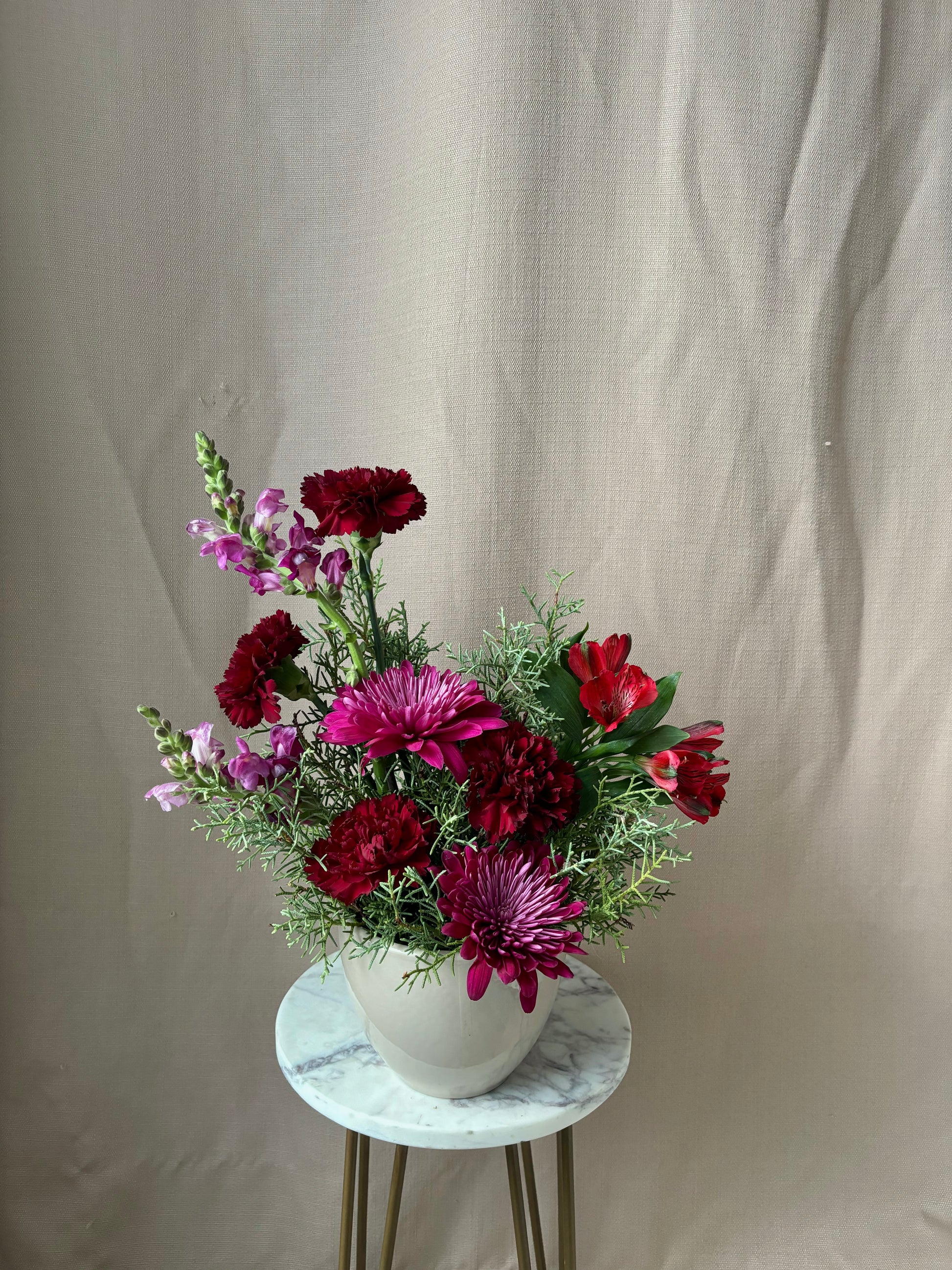 Fresh chrysanthemum, carolina sapphire, snapdragon, alstromeria, and carnation designed in a petite ceramic vase.