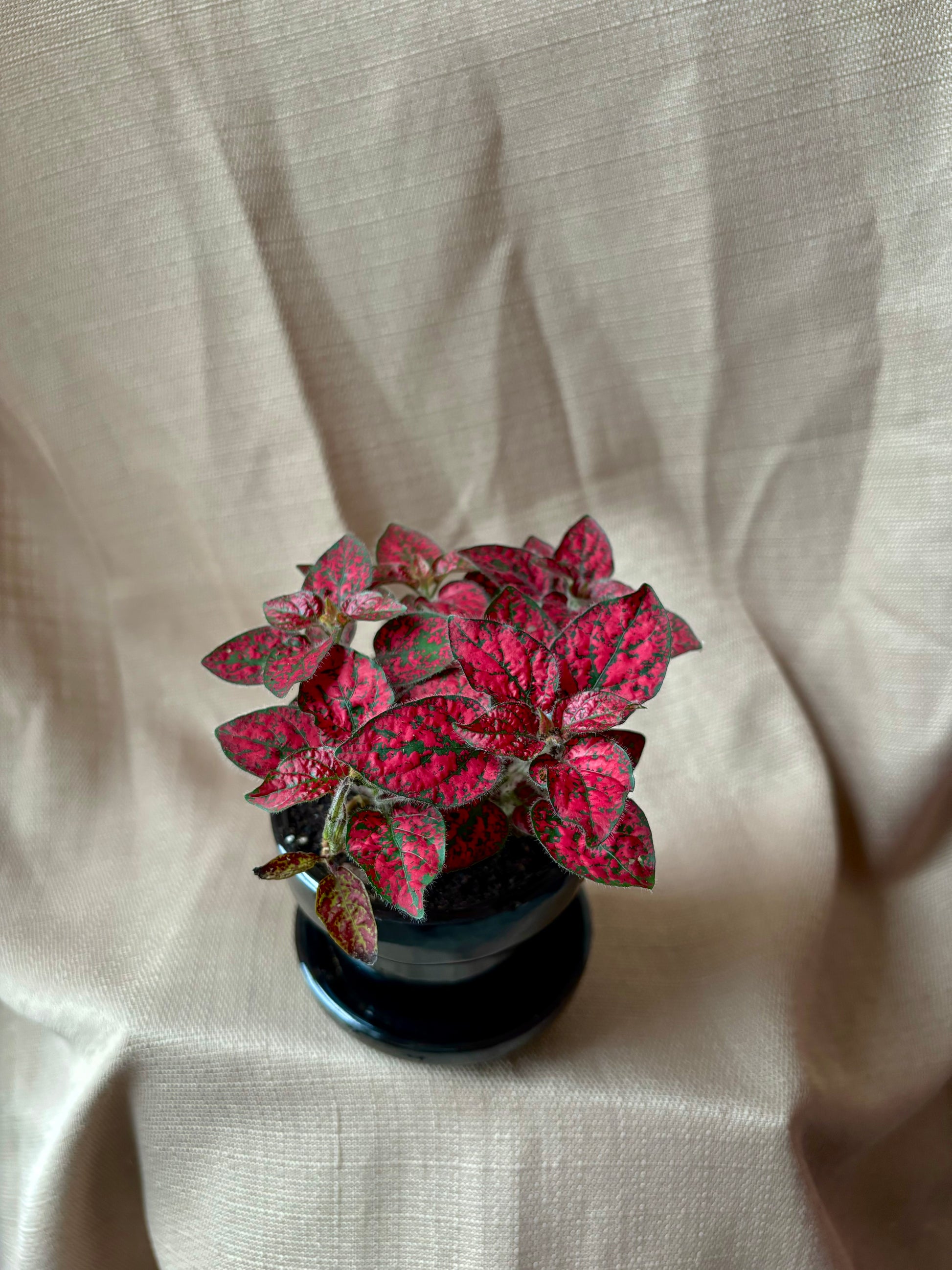 Hypoestes, commonly called the 'Polka Dot' plant, has boldly colored leaves in an eye-catching red. Planted in a 4" glazed ceramic pot with an attached plate for easy watering.